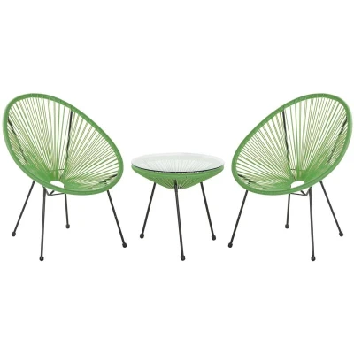 General description This modern 3-piece Bistro Set ACAPULCO II is perfect for both indoor and outdoor settings. It includes 2 chairs and a table, featuring a stylish PE-rattan string weave and a sturdy powder-coated steel frame. The tempered glass tabletop is secured with suction cups, providing ample space for beverages and snacks. Inspired by iconic Mexican design, this set adds a vibrant accent to any space. Technical specifications Product Type: Bistro Set Style: Boho General Color: Green, Black Main Material: PE Rattan Additional Material: Steel Top Material: Glass Finish: Powder Coated Seats Up To: 2 People Chair Dimensions: 70x90x87 cm Coffee Table Dimensions: 50x50x49 cm Seat Height: 41 cm Overall Dimensions: 70x90x87 cm Weight: 17 kg Chair Weight Capacity: 160 kg Table Weight Capacity: 50 kg Assembly Information Partial Assembly Required Estimated Assembly Time: 20-40 minutes Usage Suitable for both indoor and outdoor use Recommended to store under cover when not in use to
