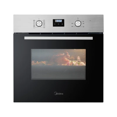 The Midea MBO65M90D2-X 70L Built-In Single Fan Oven in Stainless Steel features a large 70-litre capacity, modern White LED Digital Display with programmable timer, and 9 multi-cooking functions, making it ideal for versatile, convenient, and effortless cooking with easy-clean enamel interior.