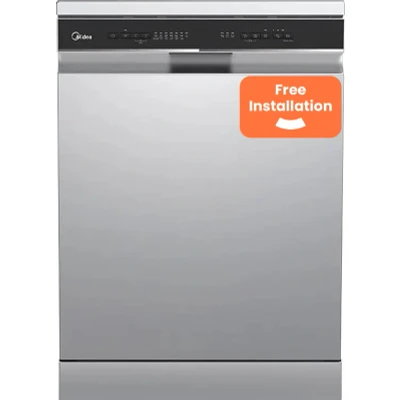 The Midea MDWEF1433D(SS)-WG-UK Freestanding Full Size Dishwasher offers a 14 place setting capacity, quiet 44 dB inverter motor, flexible racks including a third cutlery drawer, multiple wash programs, and a clear LED display—all in a modern stainless steel finish with D energy rating.