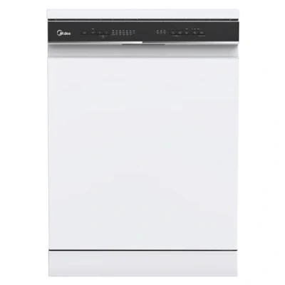The Midea MDWEF1433D(W)-WG-UK 60cm Full Size Freestanding Dishwasher offers quiet, efficient cleaning for large households with a 14 place setting capacity, WiFi app control, odour-neutralising Ion Dishfresh technology, and Auto Open Dry for improved drying, all in a sleek white design.