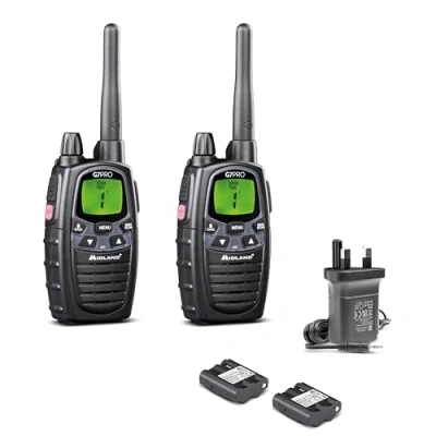 LICENSE-FREE WALKIE TALKIE WITH 16 PMR446 CHANNELS AND 69 LPD CHANNELS: The Midland G7 Pro offers clear and reliable communication with 16 PMR446 channels and 69 LPD channels. Ideal for outdoor activities such as hiking, camping, airsoft, and more, without the need for a licence RECHARGEABLE BATTERY, FAST CHARGING, AND MULTIPLE COMPATIBILITY: Equipped with 1800mAh Ni-Mh rechargeable batteries, the radio can also be powered by alkaline batteries or 800mAh Ni-Mh battery packs (not included). The radio also supports PB-PRO 1200mAh lithium batteries, making it 20% lighter ADVANCED FEATURES FOR CLEAR AND EFFICIENT COMMUNICATION: Includes a call button with 5 selectable tones, a vibrate function for calls, and Side Tone technology to eliminate noise at the end of each transmission. Additionally, it features 3 types of adjustable VOX for hands-free communication INCLUDED ACCESSORIES AND UKCA CERTIFICATION: The package includes 2 radios, 2 rechargeable batteries, a desk charger, a belt clip, and a UK plug. UKCA-compliant and certified to ensure the reliability and safety of the product INNOVATION AND RELIABILITY SINCE 1959: Midland is a leading company in radio communication and audio technology, with over 65 years of experience. Pioneers in wireless solutions, Midland develops innovative and high-quality products, designed in Italy to ensure excellent performance in every situation