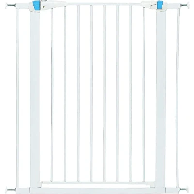 Pet gate in soft white w/glow-in-the-dark phosphorescent night safety strips, measures 1d x 39.125h inches, includes two 3 inch expanders to extend width from 29.5 inches up to 38 inches Pet gate partitions off rooms from your dog to keep them safe and out of harm's way, pet gate features two glow-in-the-dark safety strips on gate frame for additional safety and visibility at night (must be close to a light source during day to illuminate at night) One-handed operation w/ secure magnetic latch that alerts pet parent that gate door is securely closed | please note the gap between safety gate and latch will be eliminated when gate is fully installed Convenient walk-thru 19 inch wide pet door swings in either direction (spacing between vertical bars is 2.25 inches wide),pet safety gate is non-toxic, lead-free and chew-proof