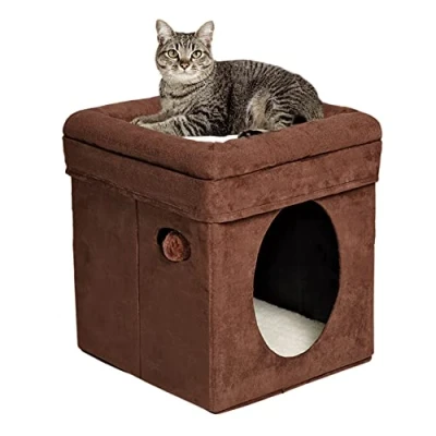 Stylish & Space-Saving Design: Measures 38.4 cm x 38.4 cm x 42 cm; Features a sleek, neutral brown faux suede exterior with a plush synthetic sheepskin top; blends seamlessly with modern home décor Cozy Dual-Level Comfort: Cushioned bed topper includes padded bolsters for elevated lounging; interior den features soft faux fur bedding for a warm, enclosed nap space Engaging Play Features: Includes a plush hanging ball toy and peek-through cut-outs on the sides; encourages play, curiosity, and mental stimulation Private & Spacious Hideaway: Designed for cats or small dogs; entryway measures 18.5cm x 25.4cm, providing easy access and a peaceful sense of security Collapsible & Easy to Assemble: Sets up in seconds with no tools required; folds flat for compact storage or travel Family Owned & Operated: Proudly family owned for over 100 years with customer support based in Indiana; we stand behind the quality of our products to help you create a safe, comfortable home for your pet Assembly Instructions Included: All setup and safety instructions are provided; please read thoroughly before assembly and use to ensure proper and secure installation
