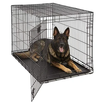48L x 30W x 33H Inches Ideal for pets 91 to 110 pounds Exceptionally versatile single-door dog crate Durable Satin Black E-Coat Finish with Easy to Clean ABS plastic pan included Easy setup and folddown to portable size. Divider panel included, allowing you to adjust your puppy's living area as it grows.