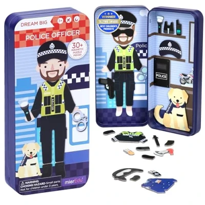JoybuyThe mierEdu Travel Magnetic Box - Police Officer is a portable magnetic play set that allows children to mix and match magnetic pieces to dress up a police officer, encouraging imaginative play and creativity on the go. Ideal for travel and easy to carry.