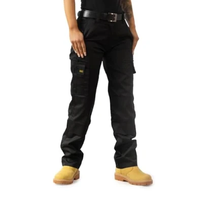 Ladies MIG Cargo Combat Work Trousers Size 8 to 18. Black or Navy Blue with Nice Semi Elasticated Waist for a Comfort Fit. Classic Side Deep Pockets on each side, Two Front Knee Pad Pockets. Two Thigh Cargo Pockets & Pen Pockets. Two Rear Cargo Pockets with Touch & Close Flaps. Large Smart Mobile Phone Pocket with Flap. YKK Zip Fly with Button Fastening. 200 GSM Polyester & Cotton.