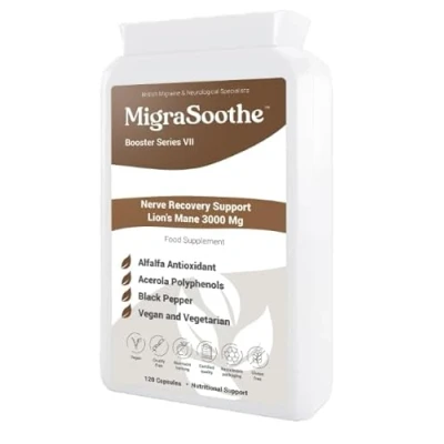 👍 NERVE RECOVERY SUPPORT & MIGRAINES - MigraSoothe Booster Series VII Lion's Mane 3000 Mg is intricately formulated to harness the historical potency of Lion's Mane mushroom, long revered for its cognitive and digestive health benefits. With 3000mg equivalent of Lion's Mane mushroom, providing 30% Polysaccharides, this supplement is a powerful ally for nerve health and recovery. 🕒 Regular usage as directed is essential, for Migraine management improvement as the maximum beneficial effect may take several months to develop for some individuals. 👍 FULL SPECTRUM FORMULATION -Each serving delivers a potent dose of 3000 mg of Lion's Mane, a mushroom renowned for its nerve-regenerative properties. This powerful formula is further enhanced with a carefully selected blend of vitamins and minerals, supporting overall nerve health and cognitive function.eg Alfalfa, Acerola Fruit yielding Vitamin C, and Black Pepper for added absorption. This strategic combination ensures that each capsule not only supports neurological function but also enhances immune defense and overall vitality . 👍 COGNITIVE & HOLISTIC WELLNESS - Celebrated for heightening focus and meditation, Lion's Mane is a venerable natural remedy that promotes digestive health and cognitive function. Our Nerve Recovery Support formula integrates nerve growth factor promoters and polyphenol supplements, enhanced with piperine for its antioxidant and cognitive support properties, marrying ancient wisdom with modern nutritional science. 👍 GUIDED BY TRADITION, BACKED BY SCIENCE - Each component is meticulously chosen to boost cognitive abilities, support nerve growth, and offer a holistic approach to well-being. Our supplement is further empowered by the synergistic effect of its ingredients, maximizing bioavailability and efficacy. If used for migraine reduction this product should be taken in conjunction with MigraSoothe Original MigraSoothe +Herbs or MigraSoothe Pro. UK MADE & ALLERGEN FREE - Crafted in the UK, MigraSoothe Booster Series VII adheres to rigorous GMP codes of practice and ISO 9001 quality standards. Free from common allergens, it's encapsulated in vegan capsules to ensure purity and potency. For enhanced migraine support, it is recommended to use in conjunction with MigraSoothe Original TM, MigraSootheTM +Herbs, or MigraSootheTM Pro.