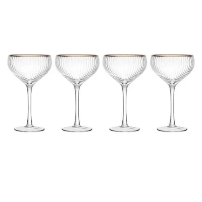Elevate your cocktail experience with the Mikasa Sorrento Ridged Crystal Set of 4 Coupe Glasses. Radiating sophistication, each glass features a captivating ribbed design encased in clear glass, adding a distinct texture to your drink presentation. Accentuating their allure, delicate gold rims gracefully embellish each glass, casting a subtle shimmer in any light.Crafted from premium lead-free crystal, these coupe glasses exude elegance, making them a refined addition to any home bar. Perfect for special occasions, they are the ideal vessels for serving Champagne or signature cocktails.Each 350ml coupe glass boasts dimensions of 9cm at the rim, 7.5cm at the foot, and stands at 18.5cm tall.Presented in a stylish gift box, this set makes a thoughtful gesture for newlyweds, first home-buyers, or a delightful indulgence for yourself.Backed by a 10 year guarantee, enjoy peace of mind with every sip.