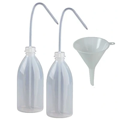 2 x high-quality spray bottles (0.5 L, unfilled) made of transparent, soft polyethylene (PE-LD) with thread GL25, including screw cap with riser. Our laboratory containers are manufactured in Germany in pharmacist quality/laboratory quality. They are also food-safe and odour-free. The universal bottle is ideal for storing and storing a wide range of liquids, e.g. medicine, cosmetics, essences, drops, glue, flavours, e-liquid, ink, paint, oil, and many other extracts. Thanks to the spray tube, the contents can be dispensed very well. The squeeze bottle is also used as a reset container for samples in the laboratory. And with the included funnel, filling should be very easy ;-) The plastic bottle is lightweight, yet very robust and durable. The material is very shatter-proof and yet flexible and easy to squeeze. It also has good chemical resistance. Dimensions: approx. Height: 16.5 cm, diameter: 7.5 cm, opening diameter: 1.8 cm, height with riser 31 cm, capacity: approx. 500 ml (measured to the top) Box contents: 2 plastic bottles of 500 ml, made of transparent plastic, in pharmacist quality, including a funnel