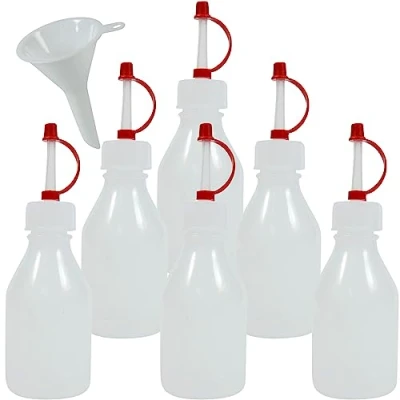 6 x high quality small dropper bottles made of transparent, soft polyethylene (PE-LD) with GL14 thread, includes drip cap with red strap and cap. Our laboratory containers are manufactured in Germany in pharmacist quality/laboratory quality. They are also food-safe and odour-free. The universal bottle is ideal for storing and storing a wide range of liquids, e.g. medicine, cosmetics, essences, drops, glue, flavours, e-liquid, ink, paint, oil, syrup and many other extracts. Thanks to the spray cap, the contents can be dispensed very well dropwise. The squeeze bottle is also great for decorating cakes, cupcakes and other foods. And with the included funnel, filling should be very easy ;-) The plastic bottle with attached cap is lightweight, yet very robust and durable. The material is very shatter-proof and yet flexible and easy to squeeze. It also has good chemical resistance. Height: 10.3 cm, diameter: 3.5 cm, opening diameter: 1.1 cm, capacity: 30 ml (measured to the top) Box contents: 6 plastic bottles of 30 ml, made of transparent plastic, in pharmacist quality, including a funnel