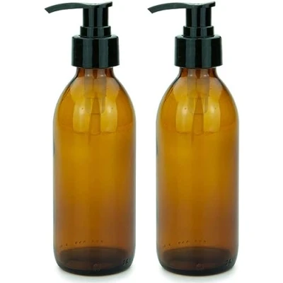 Environmentally friendly refillable brown glass bottles with dosing pump Pump bottles with 2 ml hub for detergent, shampoo, cream, syrup, etc. Dimensions: approx. Height: 14.74 cm, diameter: 5.5 cm, opening: 2 cm, capacity: approx. 200 ml (nominal volume) Material: brown glass, dosing pump made of plastic Box contents: 2 x 200 ml brown bottles with pump dispenser + 2 labels, Manufacturer: mikken
