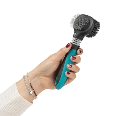 DUAL SIDED - with soft pins one side and nylon bristles the other REMOVES KNOTS & TANGLES - this brush is perfect for combing through knots and tangles REMOVES DEAD HAIR - this brush removes dead, loose hair, keeping your pet's coat healthy and shiny FLEXI-HEAD FOR COMFORT - the Mikki Flexi-head range removes excess pressure on your wrist and your pet to provide a more relaxed and gentle groom SUITABLE FOR CATS AND DOGS - suitable for short to medium smooth coated dogs and cats