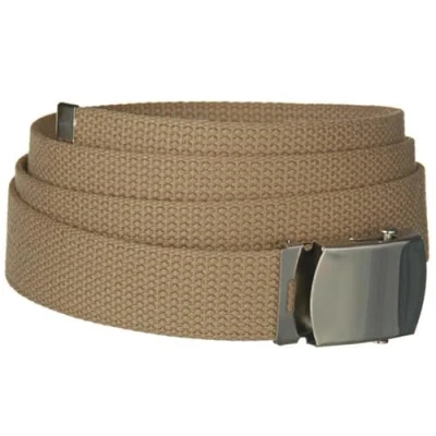 Mil tec Khaki, 100% cotton webbing US trouser belt with silver coloured metal buckle.