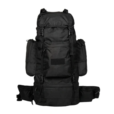 Large main compartment with drawstring and stopper, 3 outer pockets, lightweight carrying frame, padded shoulder and waist strap Chest strap, lid height adjustable with 2 zip compartments, luggage straps on lid and base Carry handle, separate bottom compartment, water-repellent