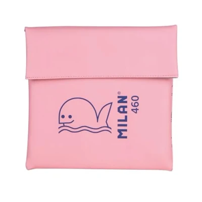 On isothermal small food holder. Thermal insulated interior (cold/heat) for better food preservation. Comfortable closure with fabric tapes by contact. Collection 460 since 1918, inspired by the original colors and design of MILAN erasers, manufactured in Spain since 1918. Pink with navy whale print Fabric composition: outer made of polyurethane (high quality with soft feel) and insulated inner lining (P.E.V.A.). Measures 18.5 x 18.5 x 1.2 cm. Capacity: 0.30 L.