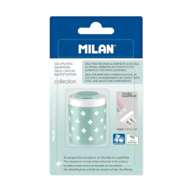 Double pencil sharpener (one standard and one MAXI) with reservoir. COLLECTION Edition + Turquoise. The pencil sharpener incorporates an extra biocide. Treated with silver phosphate glass (CAS308069-39-8) with anti-bacterial effect. Ideal for improving hygiene in school, office, food contact environments and sanitary environments. Convenient screw cap The sharpener has a sharp and sturdy carbon steel blade, ideal for all types of pencils. Item with safety blade: this system prevents the blade from being separated from the body of the sharpener, making it ideal for school use. Original design created by the R&D department of MILAN.