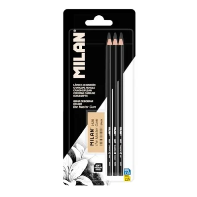 MILAN Art Charcoal Drawing Pencils and Eraser Set Round section, thick lead diameter 4 mm. Contains 3 units of different hardness (soft, medium and hard) that offer a dry stroke of different intensity. The Master Gum special soft synthetic rubber eraser for fine arts.