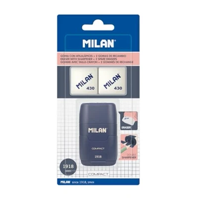 Combination eraser and double pencil sharpener (one standard and one MAXI) with reservoir. COMPACT Design, Series 1918, Blue Soft square rubber made of synthetic rubber type 'bread crumb'. The sharpener has a sharp and durable steel blade, ideal for all types of pencils. Sharpener with safety blade: This system prevents the blade from being separated from the sharpener body. Original design created by own R&D department of MILAN. Includes 2 replacement 430 erasers.