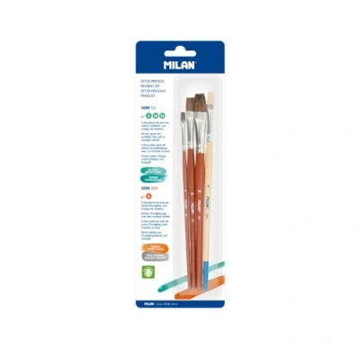 Series 121: flat brush with short wooden handle, brown varnished and aluminium ferrule. Composition: 70% natural goat hair + 30% synthetic. Suitable for watercolor, watercolor techniques and tempera. Numbers 4, 10 and 16. Series 524: flat brush with short wooden handle, painted in natural colour and aluminium ferrule. Composition: Natural Chungking bristle hair. Suitable for glue and varnishes, tempera. Number 8., Manufacturer: FACTIS, S.A.