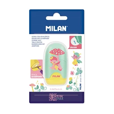Combination of eraser and pencil sharpener with reservoir. CAPSULE design, special series Fairy Tale. The sharpener has a sharp and durable steel blade, ideal for all types of pencils. Sharpener with safety blade: This system prevents the blade from being separated from the sharpener body. Original design created by MILAN R&D department. Random assorted colours: lilac, pink and turquoise. Replacement erasers available.