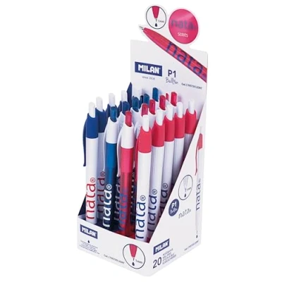 P1 Blue Ink Ballpoint Pen. Writing length is approximately 1200 m. Tip 1.0 mm. Ink made in Germany. Original design created by R&D department. MILAN nata 624 collection inspired by the original colors and design of MILAN erasers, manufactured in Spain since 1918. Pen size: 14.2 x 1.8 cm. 1 cm diameter. Contains 5 pens of each color: pink, blue, white with pink logo and white with blue logo.