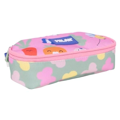 Oval pencil case with mesh inner compartment. Pink/Green special series Green & Grow with drawings of plants and flowers, mushrooms, insects and vegetables. Can be combined with colouring books. Material: Polyester Dimensions: 20.5 x 9 x 5.5 cm.