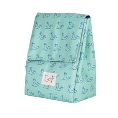 Insulated food bag. Closure with fabric tapes by contact. Adjustable glossy blue carry handle with lock. Contains 2 airtight round food containers 0.25L each. Thermal insulated interior (cold/heat) for better food preservation. Collection 460 since 1918, inspired by the original colors and design of MILAN erasers, manufactured in Spain since 1918. Green with navy blue seal print. Fabric composition: outer made of polyurethane (high quality with soft feel) and insulated inner lining (P.E.V.A.). Measures 20 x 14 x 27 cm. Capacity: 3.5 L.