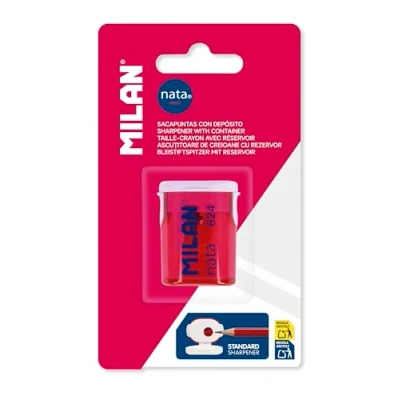 Standard pencil sharpener with reservoir. Pink and White It has a sharp and durable steel blade, ideal for all types of pencils, made in Germany. Safety system: prevents the blade from being separated from the sharpener body. MILAN nata 624 collection inspired by the original colors and design of MILAN erasers, manufactured in Spain since 1918. Sharpener measures: 4.2 x 3 x 2.2 cm.