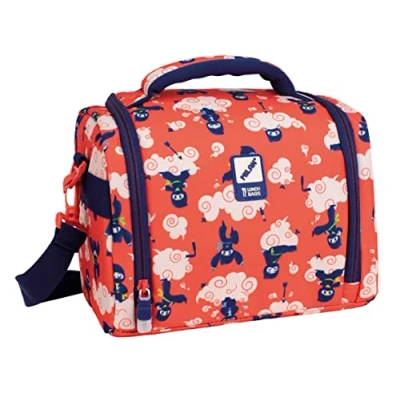 Large capacity food carrier isothermal bag. Ninjutsu special series, silent and funny ninjas jump over the clouds. Printed design on a red background with cream clouds and navy blue details. Navy blue interior lining with small shuriken stars. Thermal insulating interior (cold/heat) for better food preservation. Full opening for better accessibility and cleanliness. Adjustable and removable strap, top handle. Fabric composition: polyester outer and isothermal inner lining (P.E.V.A.). Dimensions: 24.5 x 20 x 16 cm. Capacity: 5 liters.