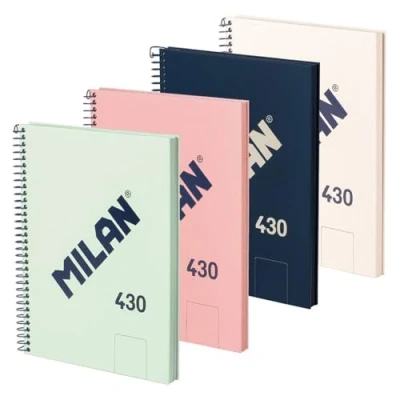 Pack of 4 A5 Wirebound Hardcover Notebooks 80 sheets blank paper High quality 95 g/m² paper, micro-perforated and with 2 holes. Cutting starter for easy separation of each blade. Rigid cardboard cover and embossed glossy MILAN logo. Flexible spiral with safety lock prevents snags and scratches on furniture. Flexible spiral with safety lock prevents snags and scratches on furniture. Collection 430 since 1918, inspired by the original colors and design of MILAN erasers, manufactured in Spain since 1918. Beige, Pink, Green and Blue