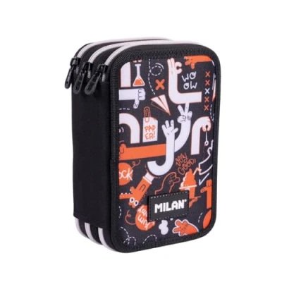 Pencil case with 3 floors that allows you to keep school supplies always tidy and easy to access. Material included: 1 x 4024 eraser, 1 x AFILA sharpener, 1 x HB graphite pencil, 3 x P1 pens (blue, black and red), 1 x 15cm triangular ruler, 12 x triangular coloured pencils, 6 x black wood metallic coloured pencils, 5 x fluorescent markers, 1 x Basic scissors, 18 x tapered tip markers. Special series Fingers, inspired by expressive gestures of universal communication and hand games, combining black, orange and white colors in a fun print. Fabric composition: polyester. Dimensions: 19.5 x 13 x 7.5 cm.