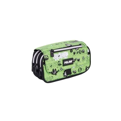 Large capacity pencil case with 3 zip pockets and a small front pocket on the flap. Snap button closure. Special series Tandem 2, a design that shows us characters of very different kinds strolling at night in tandem. Dinosaurs, crocodiles and aliens travel in tandem, and so do the fun toast, eggs and croissants, which work in groups and paddle in the same direction. Black and white prints on a green background. Fabric composition: polyester. Dimensions: 13 x 24 x 10 cm.