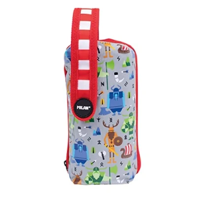 Kit 4 pencil cases with contents, which allows to keep school supplies always tidy and easy to access. The 4 inner cases can be removed and reattached with the Velcro. Special series Vikings, brave Vikings ready to set sail with their long drakkar ships. Design printed with runes and imaginary of the time on a grey background, combined with white and red stripes reminiscent of the sails of Viking ships. School supplies included: 1 x 4024 eraser, 2 x sharpener (AFILA and MAXI), 1 x HB graphite pencil, 3 x P1 Touch pens (blue, green, and red), 1 x 15 cm ruler, 10 x Ergo coloured pencils and 12 x tapered tip markers. Fabric composition: outer and polyester inner lining. Interior with white and red stripe print. Dimensions: 22.5 x 11.5 x 11 cm.