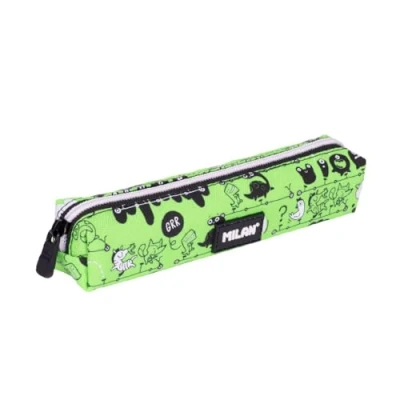 Small and practical pencil case, only to carry what you need. Special series Tandem 2, a design that shows us characters of very different kinds strolling at night in tandem. Dinosaurs, crocodiles and aliens travel in tandem, and so do the fun toast, eggs and croissants, which work in groups and paddle in the same direction. Black and white prints on a green background. Black inner lining. Fabric composition: polyester. Dimensions: 20.5 x 4.5 x 5 cm.