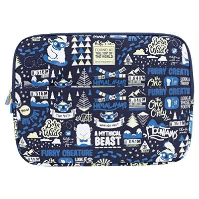 The YETI special series laptop case, the abominable snowman returns with a design full of references to the Himalayan mountains. On the navy blue background, the illustrations in white, with details in yellow and blue. With front pocket. Fabric composition: outer and polyester inner lining. External dimensions: 34.5 x 26 x 2.5 cm. Interior: 32.5 x 24 cm (13 inches).