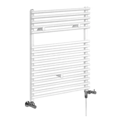 Ensure that your towels always feel perfectly warmed ready for use with the modern Milano Arno dual fuel bar on bar heated towel rail. Accentuated by an attractive white powder coated finish the towel rail is made from premium quality steel and provides space to keep your towels hung neatly and your bathroom looking tidy. Dual fuel functionality means that the towel rail can be used within a central heating system or electrically using the 400W Rotfil heating element. A pair of chrome angled valves are included to complement the stylish aesthetic. - White dual fuel bar on bar heated towel rail - Steel construction with hard-wearing finish - Dual fuel to allow central heating or electric use - Generous heat output plus 400W heating element - Supplied with a pair of chrome angled valves - Includes the fixings needed for installation - Certified and tested to EN442 standard - ISO9001:2015 registered manufacturer - This product is covered for 10 years - Dimensions: 730mm x 450mm x 53.5mm