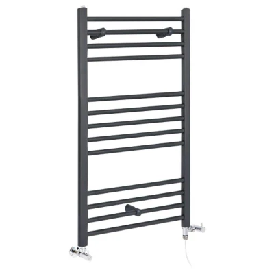 Ensure that your towels always feel perfectly warmed ready for use with the modern Milano Artle dual fuel straight heated towel rail. Accentuated by an attractive anthracite powder coated finish the towel rail is made from premium quality steel and provides space to keep your towels hung neatly and your bathroom looking tidy. Dual fuel functionality means that the towel rail can be used within a central heating system or electrically using the 400W Rotfil heating element. A pair of anthracite angled valves are included to complement the stylish aesthetic. - Anthracite dual fuel straight bar heated towel rail - Steel construction with hard-wearing finish - Dual fuel to allow central heating or electric use - Generous heat output plus 400W heating element - Supplied with a pair of anthracite angled valves - Includes the fixings needed for installation - Certified and tested to EN442 standard - ISO9001:2015 registered manufacturer - This product is covered for 10 years - Dimensions: