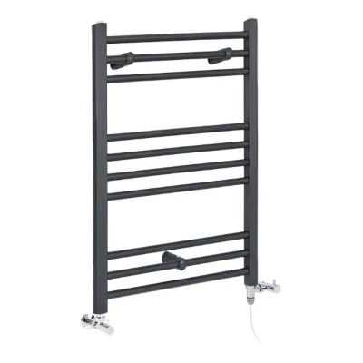 Ensure that your towels always feel perfectly warmed ready for use with the modern Milano Artle dual fuel straight heated towel rail. Accentuated by an attractive anthracite powder coated finish the towel rail is made from premium quality steel and provides space to keep your towels hung neatly and your bathroom looking tidy. Dual fuel functionality means that the towel rail can be used within a central heating system or electrically using the 400W Rotfil heating element. A pair of anthracite angled valves are included to complement the stylish aesthetic. - Anthracite dual fuel straight bar heated towel rail - Steel construction with hard-wearing finish - Dual fuel to allow central heating or electric use - Generous heat output plus 400W heating element - Supplied with a pair of anthracite angled valves - Includes the fixings needed for installation - Certified and tested to EN442 standard - ISO9001:2015 registered manufacturer - This product is covered for 10 years - Dimensions:
