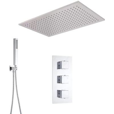 Add modern style to your bathroom whilst enjoying a refreshing showering experience with the Milano Arvo two outlet shower system which includes a triple diverter thermostatic valve 800mm x 500mm ceiling-mounted shower head and a hand shower kit. Accentuated by a sleek chrome finish throughout the contemporary shower system offers thermostatic control for accurate adjustments of the temperature and flow of water to the two outlets using the ergonomic square handles and intuitive diverter on the premium quality solid brass valve. The anti-corrosive stainless steel shower head provides rainfall effect coverage and is complemented perfectly by the hand shower with its soothing water output to allow you to enjoy a luxurious shower. The integrated anti-scald technology ensures that you will be able to shower in safety without any sudden changes in temperature. This multi-function shower can operate two of the three outlets simultaneously if required giving you total control to enjoy your