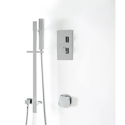 Enhance the comfort of your shower and bath with the chrome Milano Arvo two outlet bath and shower system which includes a triple thermostatic valve overflow bath filler and riser rail with hand shower kit. Featuring square handles for simple control of the outlets separately or together the premium quality solid brass thermostatic valve incorporates anti-scald technology to prevent sudden changes to temperature for safe use every time. The riser rail allows for perfect positioning of the ergonomic ABS hand shower for users of any height and delivers a soothing spray. Designed to keep the side of your bath free of taps for a minimalist look the brass bath filler sits neatly in your bath's overflow and includes an easy to use push button click-clack waste. - Modern two outlet bath and shower system to complement any contemporary bathroom - Solid brass valve with ceramic disc technology to prevent leaks and drips - Includes an ABS hand shower 1.75m hose outlet elbow and riser rail