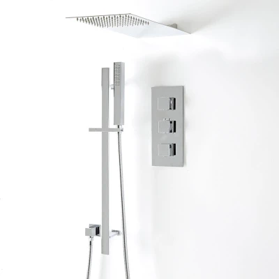 Enjoy a showering experience that feels luxurious and refreshing with the chrome Milano Arvo two outlet shower system which is made up of a triple thermostatic valve wall-mounted thin shower head and riser rail with hand shower kit. Thermostatic control from the premium quality solid brass valve using the intuitive square handles ensures perfect control of the outlets together or separately. Anti-scald technology prevents sudden changes in temperature to ensure that you will enjoy a safe shower every time. The anti-corrosive stainless steel shower head produces rainfall water coverage and is perfectly complemented by the ergonomic hand shower which can be adjusted to the desired height on the riser rail to suit users of any size. - Modern two outlet shower system to complement any contemporary bathroom - Anti-corrosive stainless steel wall-mounted 200mm x 487mm shower head - Solid brass valve with ceramic disc technology to prevent leaks and drips - Includes an ABS hand shower 1.75m