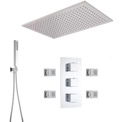 Create a spa-like experience in your bathroom and add a touch of modern style with the Milano Arvo three outlet shower system which is made up of a triple diverter thermostatic shower valve 800mm x 500mm ceiling mounted shower head hand shower kit and four body jets. The anti-corrosive stainless steel shower head provides refreshing rainfall effect coverage and is complemented by the relaxing flow of the hand shower and massaging spray of the body jets to allow you to enjoy a luxurious shower anytime you want. Thanks to the thermostatic control adjustment of the temperature and flow of water can be easily done using the ergonomic square handles and intuitive diverter. Safety whilst showering is provided courtesy of the anti-scald technology integrated into the premium quality solid brass valve. This multi-function shower can operate two of the three outlets simultaneously giving total control over your shower. - Solid brass construction with chrome finish - Modern two outlet shower