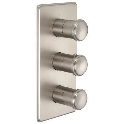 General description Effortlessly control two outlets simultaneously with the modern Milano Ashurst triple thermostatic shower valve, which boasts a stylish brushed nickel finish. With thermostatic control and ergonomic round handles, you can easily adjust the flow and temperature of water to create your own luxurious and safe showering experience thanks to the incorporated anti-scald technology. The concealed design offers a minimalist look to enhance any contemporary bathroom, while the premium quality lead-free solid brass construction ensures long-lasting durability. Technical specifications Material: Lead-free solid brass Finish: Brushed nickel Dimensions: 120mm x 55-80mm x 275mm Inlet connection: 1/2” Minimum recommended pressure: 1.0 bar Usage Thermostatic control to prevent scalding and freezing Anti-scald technology ensures a safe shower every time Override button to exceed the normal pre-set maximum temperature Ergonomic round handles for simple and intuitive use Provides