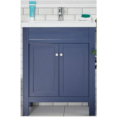 AmazonTraditional navy blue vanity unit with basin FSC certified engineered wood and premium quality ceramic construction Storage space within cupboard with integral shelf and soft close doors Assembly required using the included intuitive instructions Dimensions (WxDxH): 615mm x 400mm x 840mm