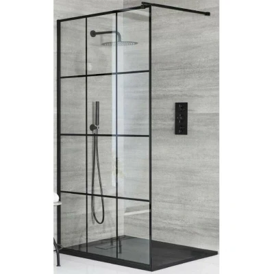 Milano Barq Black Walk In Wet Room Shower Enclosure with Grid Pattern Screen Support Arm and Graphite Slate Effect Tray 800mm x
