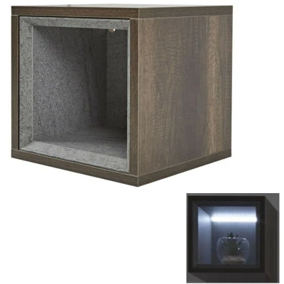 General description The wall-mounted Milano Bexley open storage unit enhances the contemporary look of your bathroom while providing practical storage space for toiletries. With a modern dark oak woodgrain effect finish, the cube design can also serve as a display area for decorative objects. Integrated energy-efficient LED lighting stylishly illuminates the contents. Technical specifications Material: FSC engineered wood Finish: Dark oak woodgrain effect Dimensions: 300mm x 300mm x 300mm (external); 228mm x 264mm x 228mm (internal) LED touch sensor can be fitted either side of the unit Installation Wall hung design for a contemporary look Includes fixings to attach the unit to the wall Supplied ready assembled for easy installation Other information This product is covered for 5 years Only one storage unit is supplied