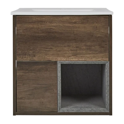 AmazonFSC engineered wood and ceramic construction Dimensions: 610mm x 465mm x 618mm Hard-wearing dark oak effect finish Two soft close drawers and open shelf You will need a mono basin tap, slotted or universal waste and flexible bottle trap Supplied ready assembled for easy installation