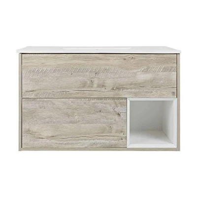 AmazonFSC engineered wood and ceramic construction Dimensions: 1010mm x 465mm x 618mm Hard-wearing light oak effect finish Two soft close drawers and an open shelf You will need a mono basin tap, slotted or universal waste and flexible bottle trap Supplied ready assembled for easy installation