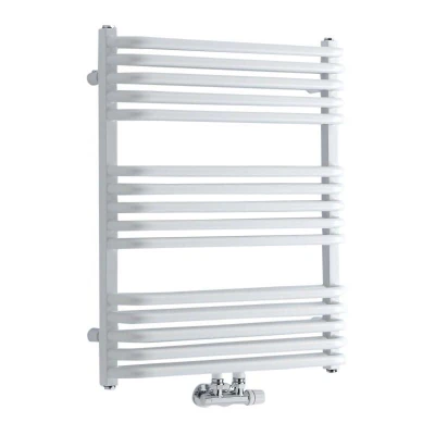 General description Keep your towels tidy and perfectly warmed with the modern Milano Bow heated towel rail featuring middle connection valve inlets. This towel rail boasts an attractive D-shaped bar design, made from premium quality steel and finished with a contemporary white powder coating. With its impressive heat output, your towels will always feel cozy and ready for use. Technical specifications Dimensions: 736mm x 600mm x 122mm Heat output: 2364 BTUs / 693 Watts (T50); 1252 BTUs / 367 Watts (T30) Construction material: Steel Finish: White powder coated Tested and certified to BS EN 442 standard ISO9001:2015 registered manufacturer Compatibility and accessories Includes blanking and bleed plug plus fixings Radiator valves are required (not included) Other information This product is covered for 10 years