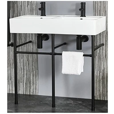 AmazonModern rectangular bathroom double basin with single tap-hole per basin and black washstand with integral towel rail Ceramic and stainless steel construction Dimensions: 820mm x 420mm x 865mm Fitting kit allows easy installation in your bathroom You will need 2x mono basin taps, 2x slotted or universal wastes and 2x bottle traps - washstand requires assembly, Weight: 60.957815443 Pounds, Manufacturer: Milano
